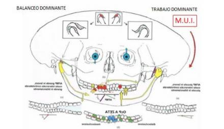 在正面的角度来看,在缺乏肌肉补偿的情况下,颞下颌关节失位导致脊柱侧弯。这种对姿势的损害程度与牙齿的不完全挤压程度成正比。
