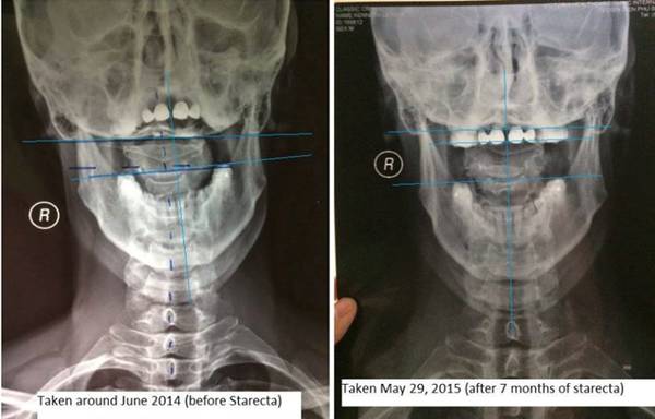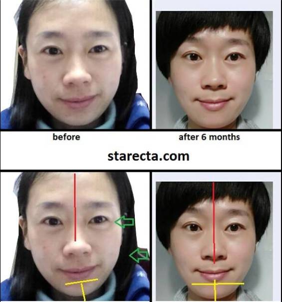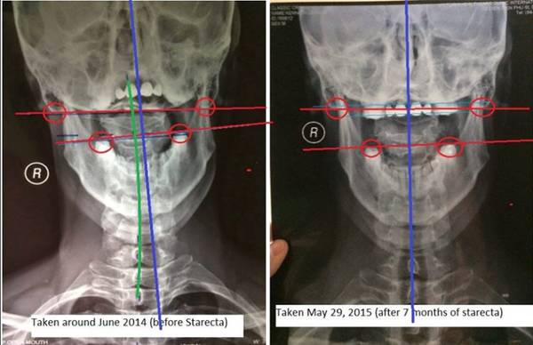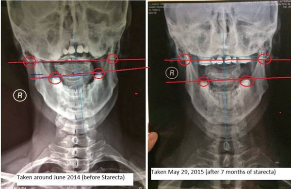 医生说这不可能从牙齿矫正姿势,她这个年纪骨头已经钙化。然后她展示自己之前的歪曲的眼和嘴,医生惊呆了。她很高兴脖子不再持续的痛,现在焕发了青春。
