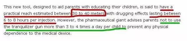 我有种不太好的预感,让我们来看看他手中的报道:某英文网站称美国食品药品管理局(FDA)近期竟然批准生产并销售一种新型的医疗器械——家用麻醉枪,用于放倒家中的“熊孩子”。